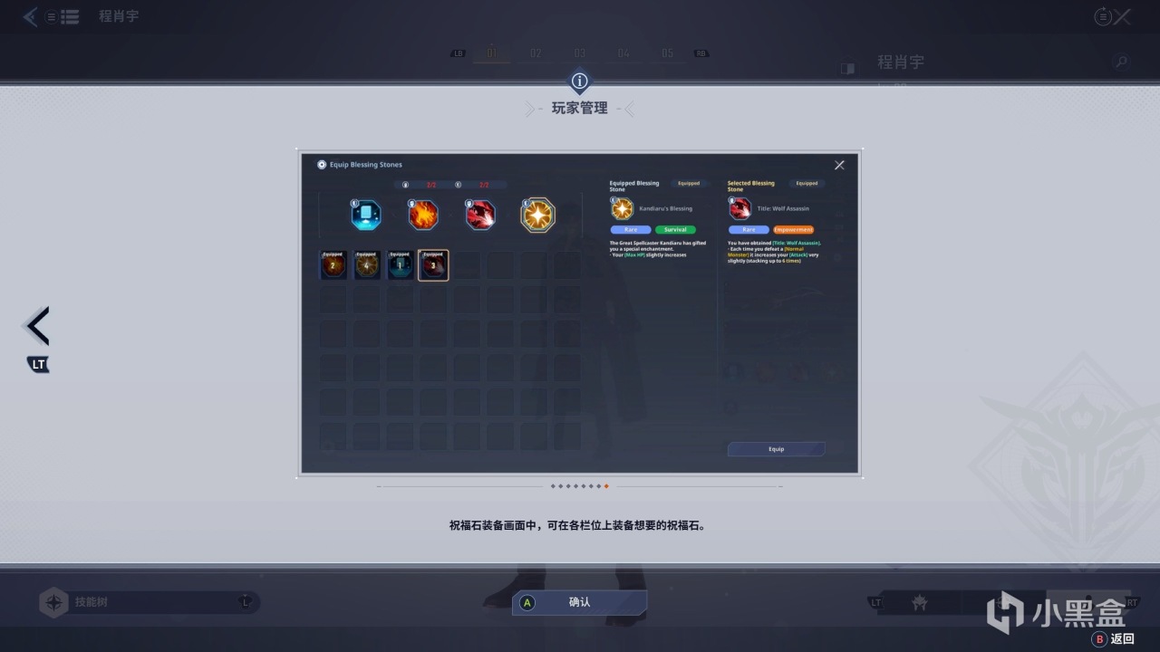 同样不可或缺的还有技能树与加点,都是常规养成操作了,这都不用多说。游戏中还会有祝福石这一套系统,四个栏位装备不同效果的祝福石进一步增强实力 ,可以根据自己的玩法流派携带相应的祝福石,更加有利于我们的战斗