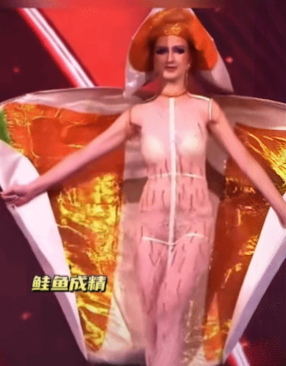 表演高潮出现在莱奥诺拉优雅脱去外层鱼壳的瞬间,展现出一件模仿三文鱼鱼肉的半透明紧身衣,这一创意“变身”引发全场欢呼。现场解说称,这款礼服既体现了她作为军乐队领队的灵动,也展现了挪威主导出口产品的精髓。