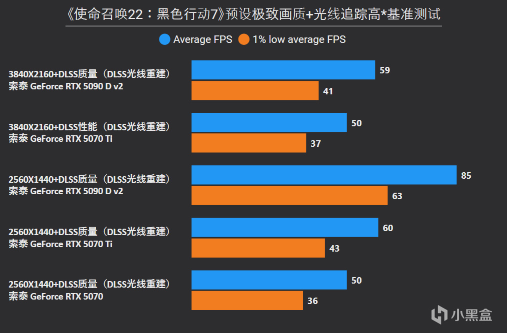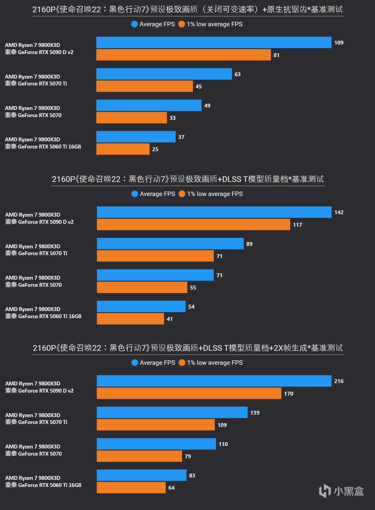 4K分辨率,对于RTX 5060 Ti原生抗锯齿还差点意思,可以搭配DLSS质量档促使平均帧率达到54fps,打打战役和僵尸模式还可以的。入门高刷门槛,则需要匹配到RTX 5070 Ti级别,并且实际需要把DLSS质量换成平衡档才能达标,至于4K主流级高刷,只能用到旗舰级的RTX 5090 D v2,借助DLSS质量档,它的1% LOW帧表现甚至可以达到117fps。