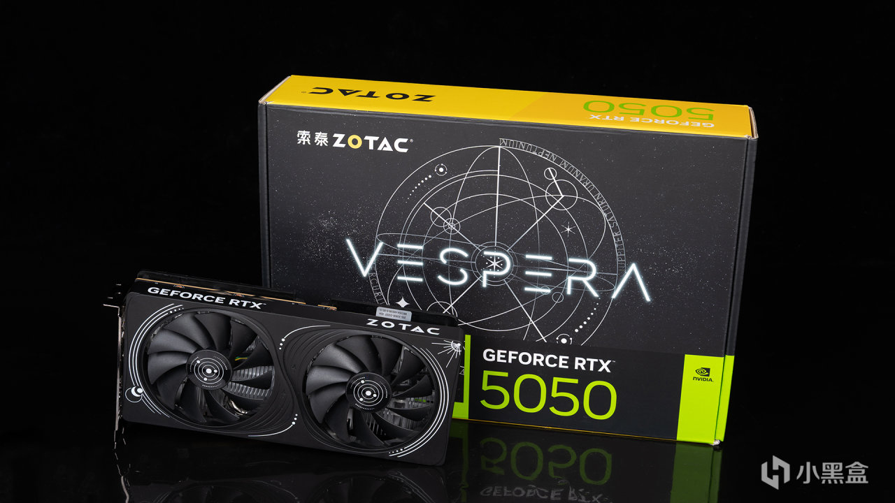 第六款是索泰的入门甜点产品——GEFORCE RTX 5050 星夜 OC HA,外观是另一番风味的深邃黑主题,表面上有星辰、星轨等宇宙星空元素融入,也提供白色版本的星辰,内部配置和整体尺寸和上述RTX 5060完全一致。