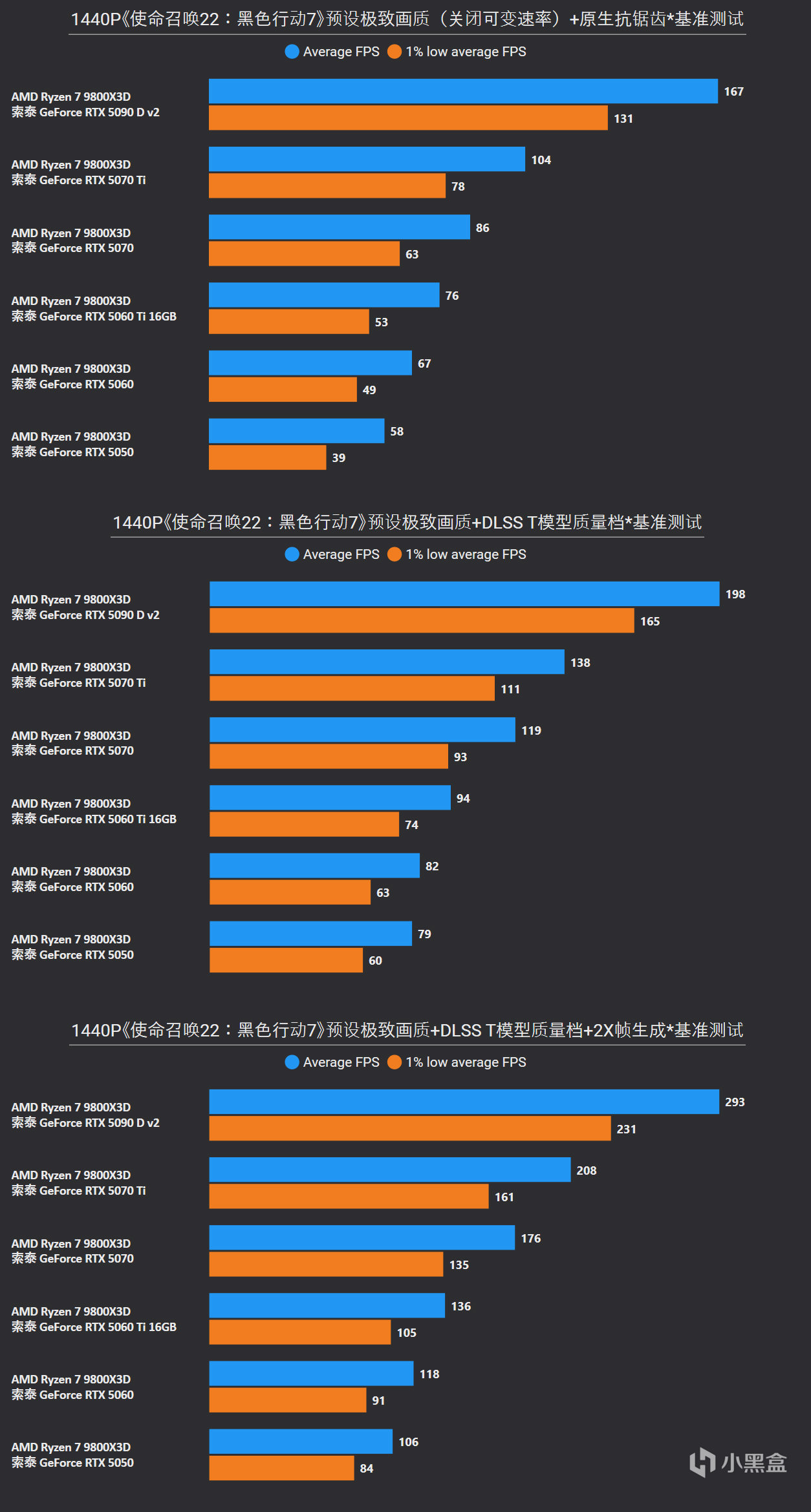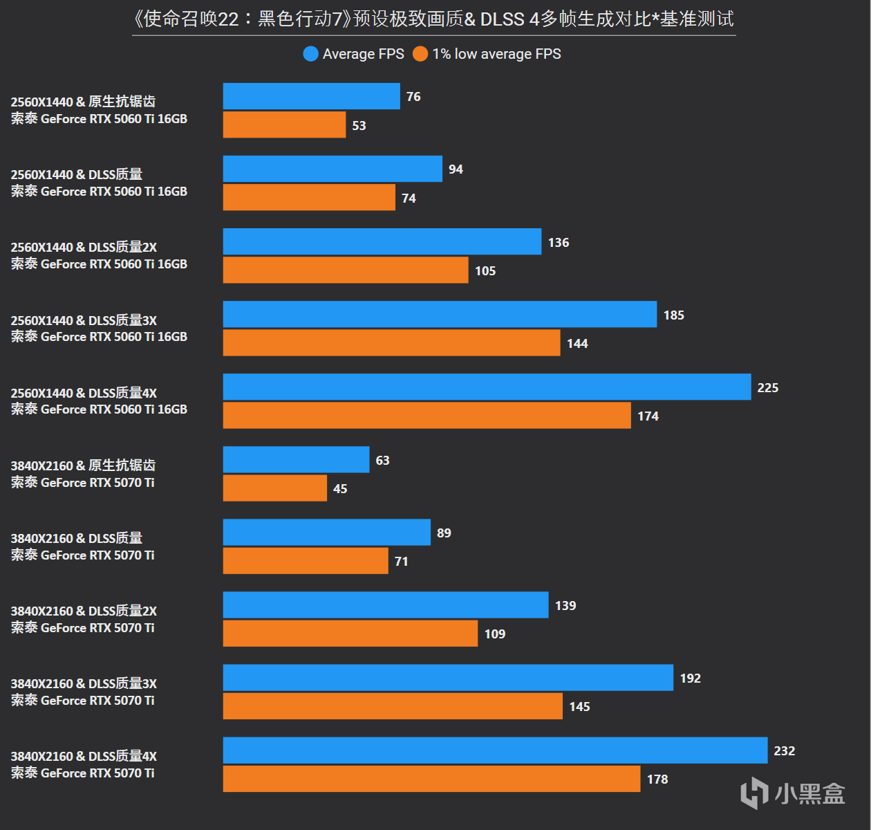 2K分辨率,原生抗锯齿下,RTX 5060和5050平均帧率差距并不大,不过后者1% LOW帧会比较低,但是开启DLSS质量档后,两者无论是平均帧和1% LOW帧表现都趋向一致了,原因很简单归结于相对贫瘠的8GB显存。入门高刷标准建议可以RTX 5070起步(需要搭配DLSS质量档),主流高刷则是RTX 5070 Ti刚好可达标。