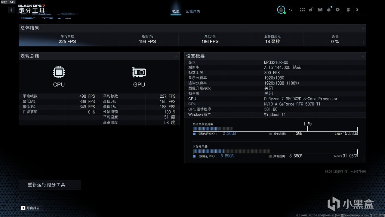 《使命召唤22:黑色行动7》内置了非常方便的跑分工具,选择地图是【突袭】(多人模式中实打实存在的),位于日本地域的一个豪华庄园,基准过程涉及俯视切换第一人称,再到枪战、爆炸、烟雾等物理效果,强度和多人模式完全一致。提供的测试结果相当全面,针对场景划分了五个区域,包括平均帧数、最低5%(5% LOW)、最低1%(1% LOW)、服务器延迟和丢包等详细数据。