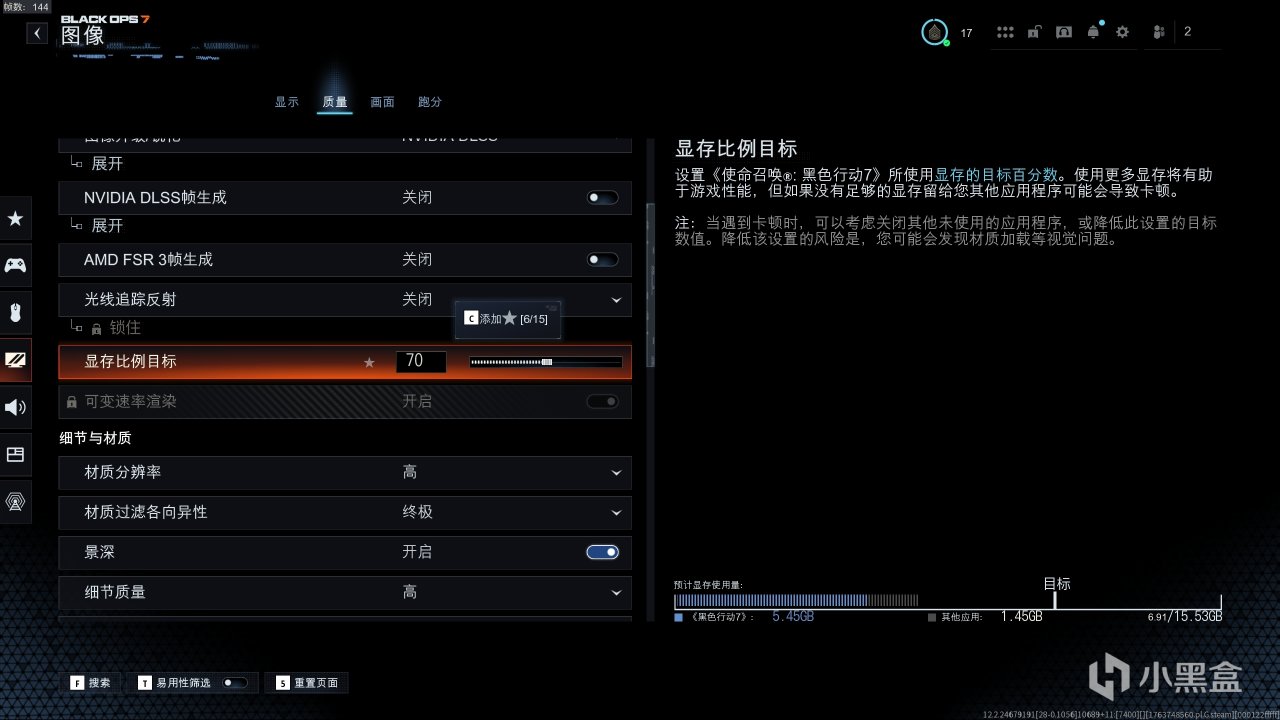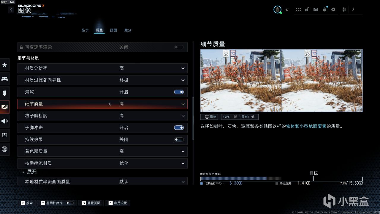 《使命召唤22:黑色行动7》整体UI样式还是很有COD的独特韵味,预设画质氛围最低、基础、平衡、终极和极致五档,其中最低档在降画质基础上,还把渲染分辨率设置到50%,能更好适配低端机器的用户。整体画质选项和COD21基本一致,只是重新加入了光线追踪反射,右侧区域还清楚标注了对CPU、GPU和显存等影响指标,下方还有预计显存使用量占用条可参考。