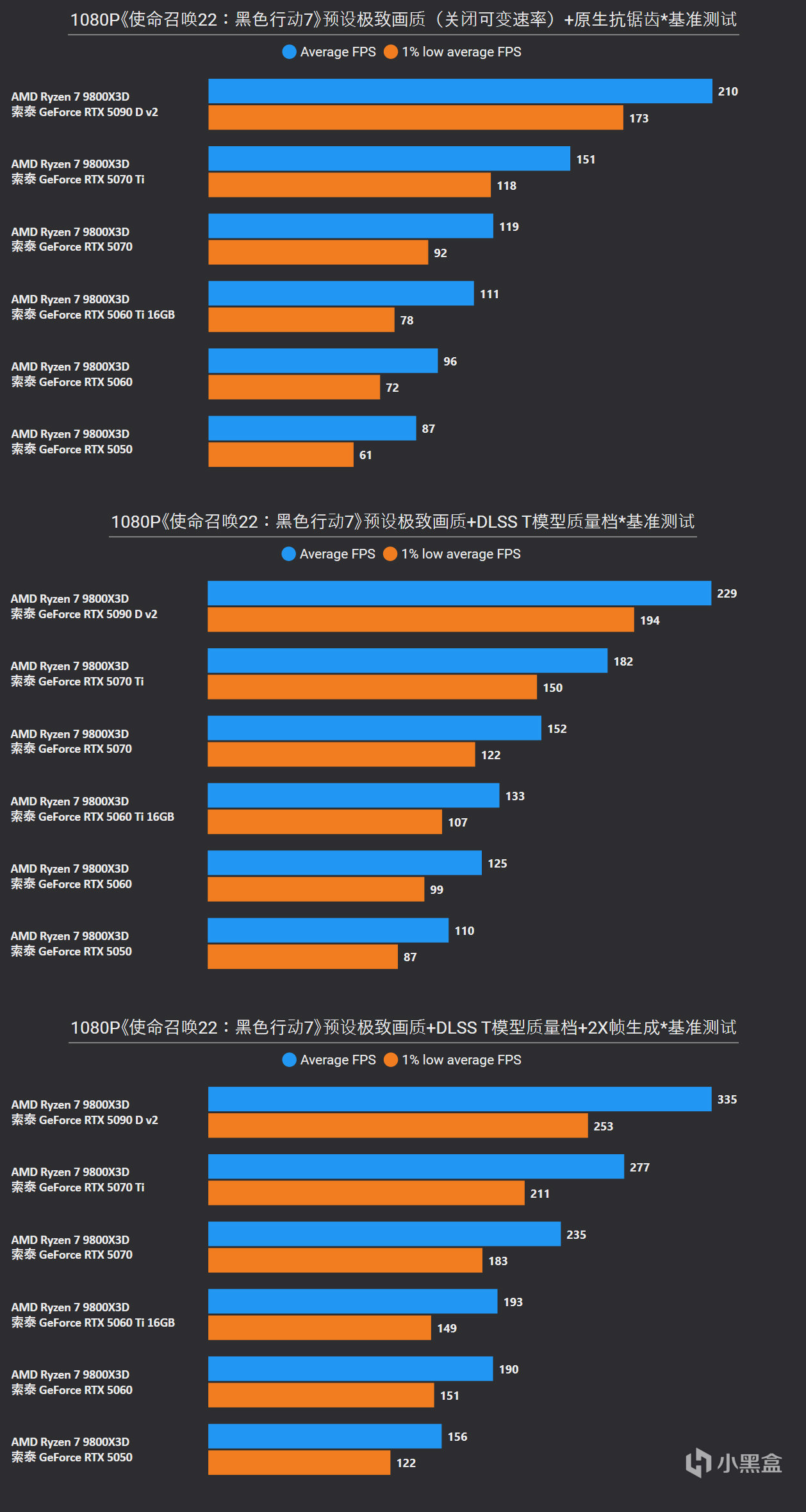 1080P极致画质,原生抗锯齿RTX 5050都能跑到平均87fps,并且1% LOW帧也能稳住,使用DLSS质量档还能顺利突破100fps高刷入门标准,不过RTX 5060/5060 Ti/5070三张显卡在1080P中不太能拉开差距,除非使用DLSS或者叠加帧生成,比如5070使用DLSS后可达成平均152fps,属于更主流的高刷门槛,至于旗舰级的RTX 5090 D v2就直奔200fps以上了。