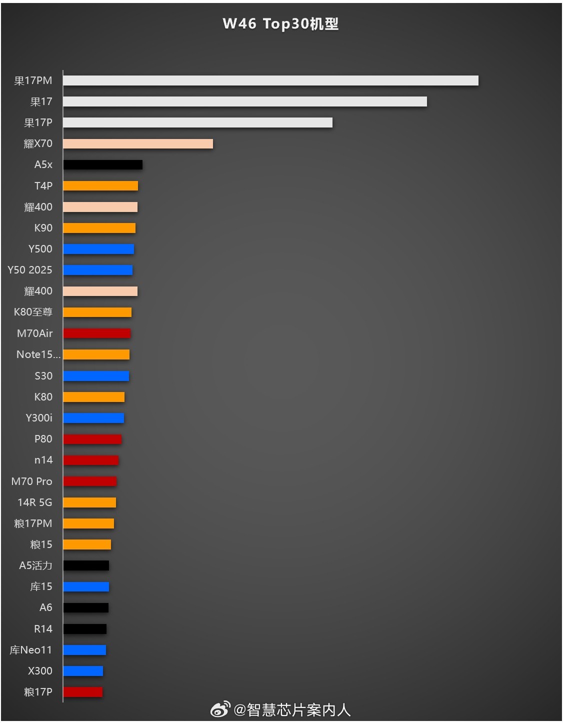 国产安卓4大品牌的年度旗舰发布都超过一个月了,热度逐渐退去,销量表现又如何呢?最新一周(W46)TOP30机型出炉,新发布的安卓旗舰手机仅有3款进入前30,并且排名都在20名开外,小米17ProMax排名21、vivo X300排名29,小米17Pro排名30,其他新发布的安卓旗舰未进入前30。