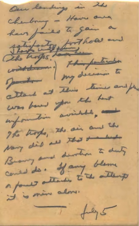 大意是:我军在瑟堡—勒哈弗尔地区的登陆已经失败,军队未能夺下理想的立足点,我已经命令他们撤退。我选择这一时间于这一地点发动登陆,是基于手上所有情报分析做出的决定。海陆空三军将士表现十分英勇,他们已经竭尽所能,不辱使命。如果必须有人为此本次行动的失败负责,那么我个人为此承担一切责任。