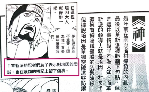 内战结束后,以长门控制的佩恩为首的“革新派”获胜(原统治者山椒鱼半藏被击杀),村子再次进入了一种“相对的安定”,而革新派的忍者为了表达对领导人佩恩的忠诚,也会在自己的护额上划上这么一道。