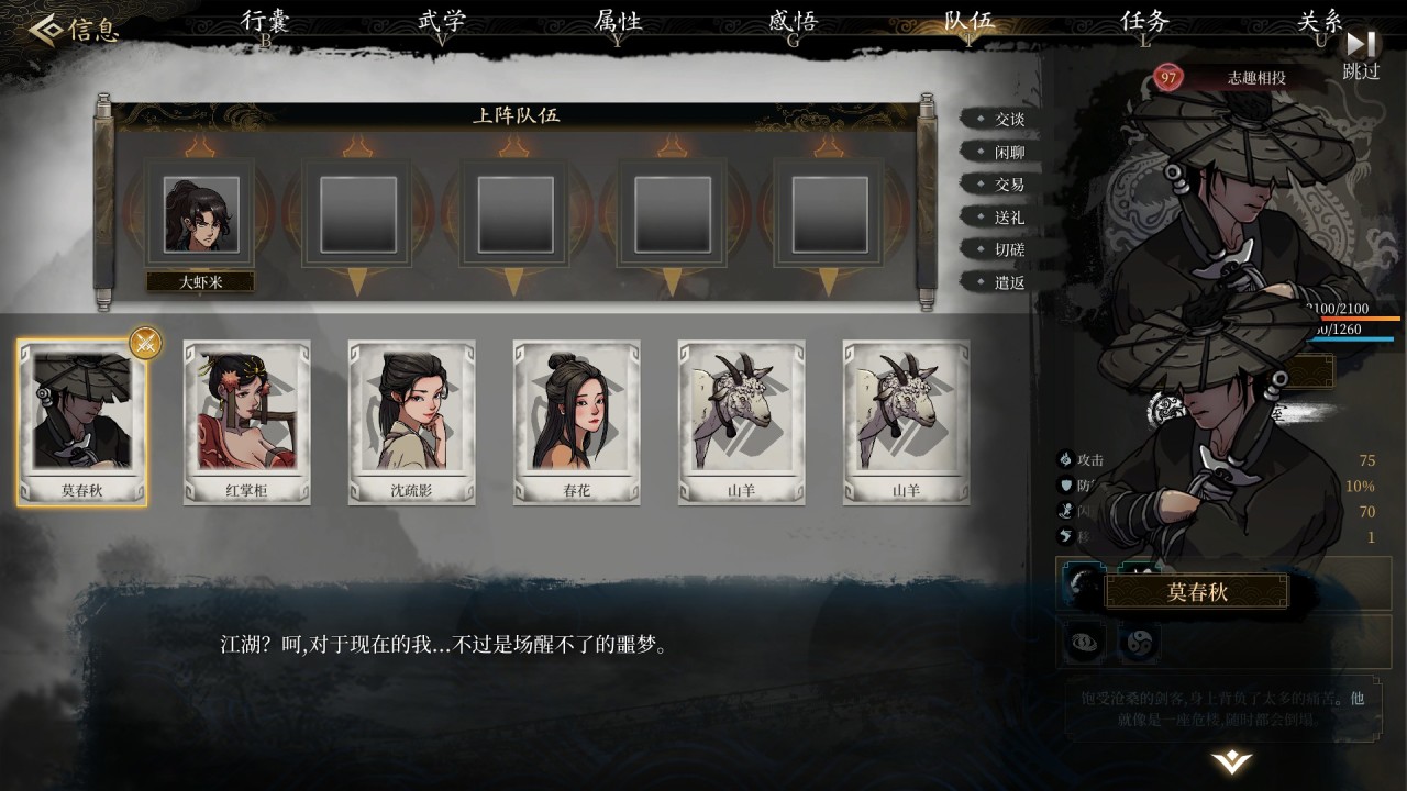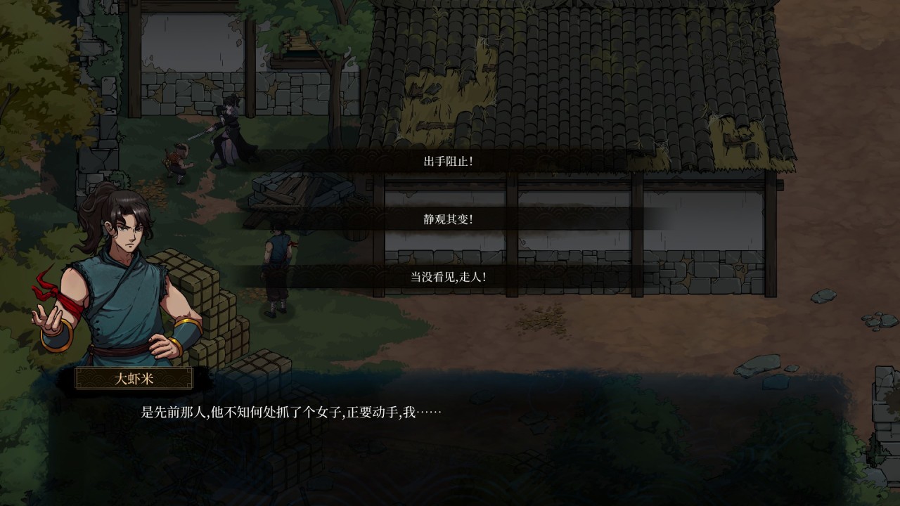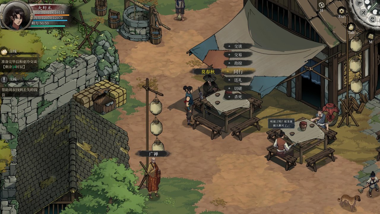 取而代之的是在多数武侠沙盒中出现的对于NPC的交谈、劫掠、击杀、邀为同道、交易等选项。
