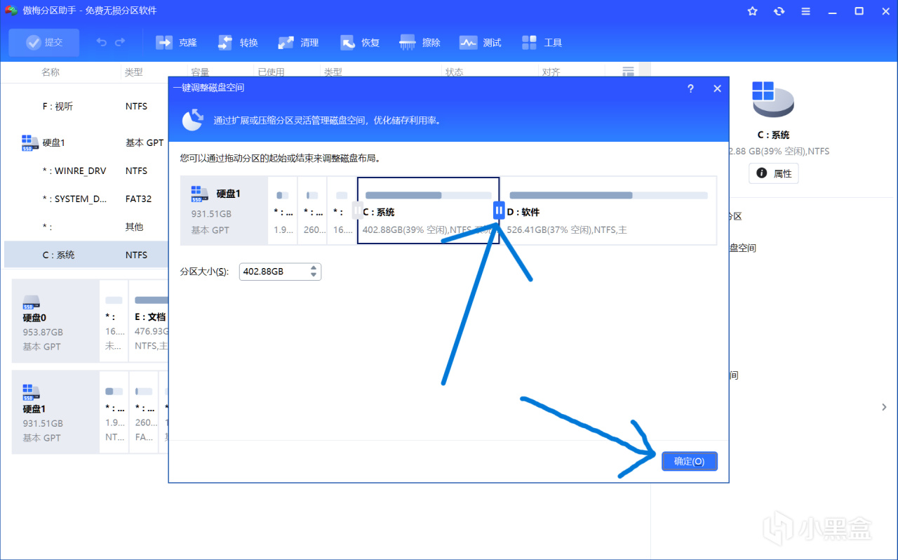 1.拖动如图所示的按钮就能随意的对c盘的大小进行调整了。