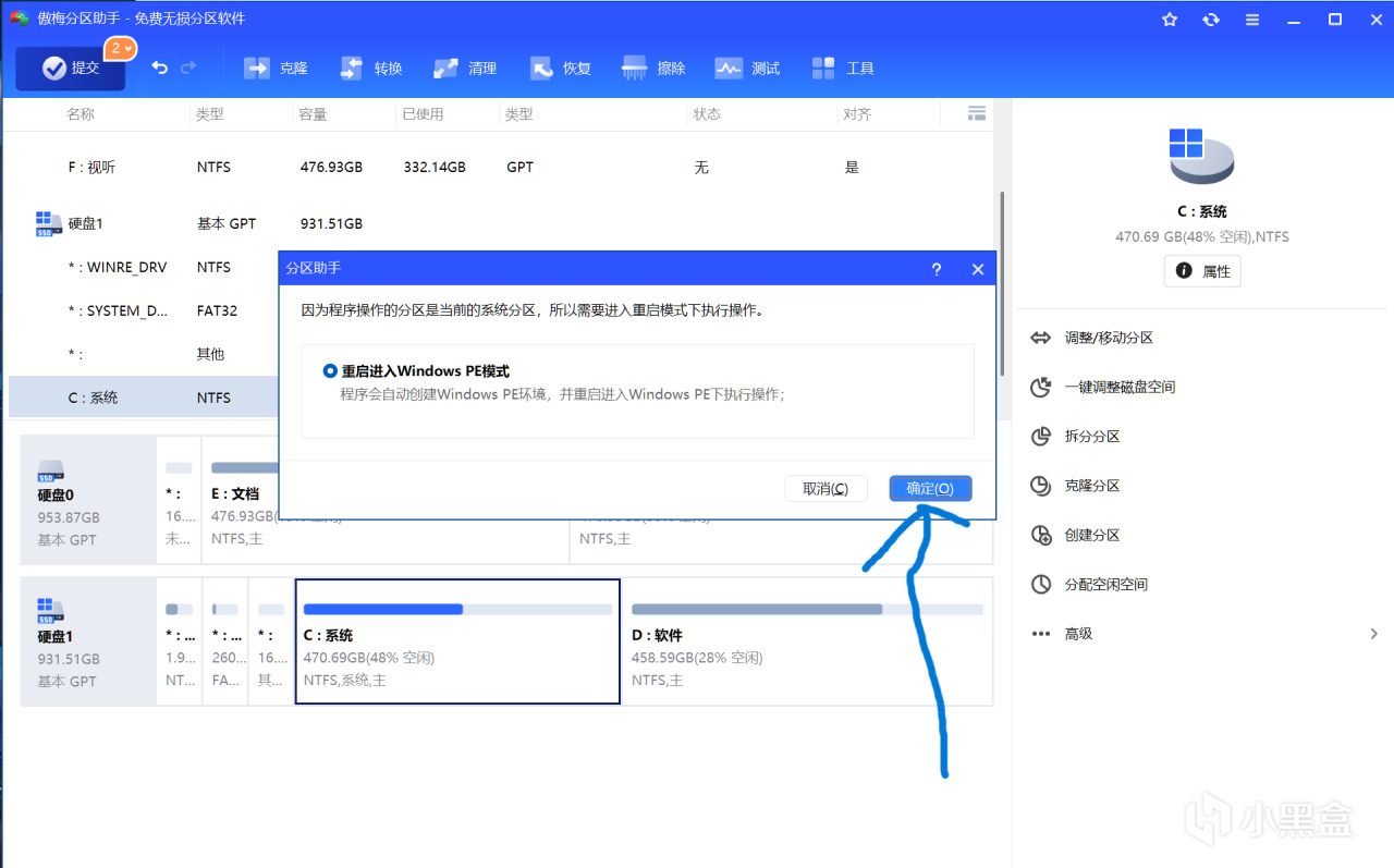 点击确定后就会进入程序创建的pe系统中,期间不要有任何操作,程序完成储存空间的挪移之后,系统会自动重启,重启后c盘就扩容成功了