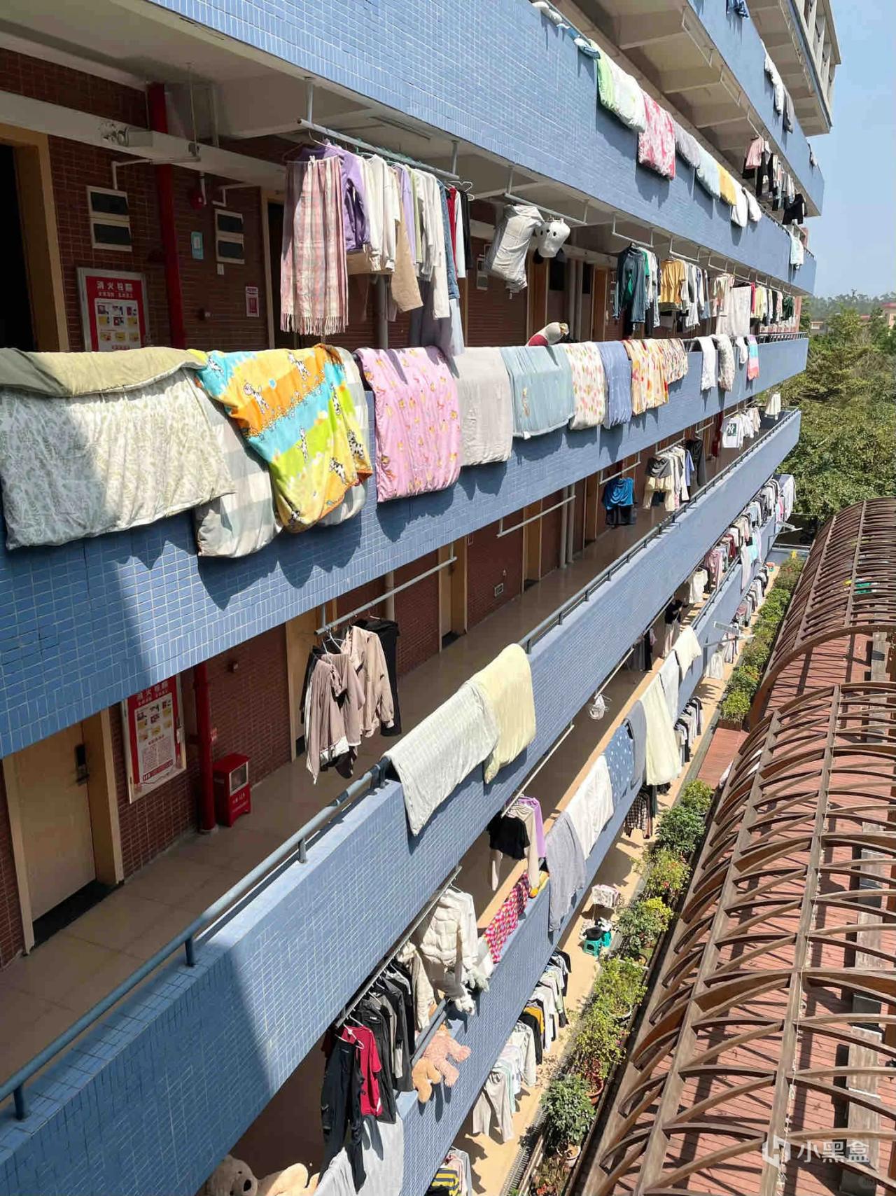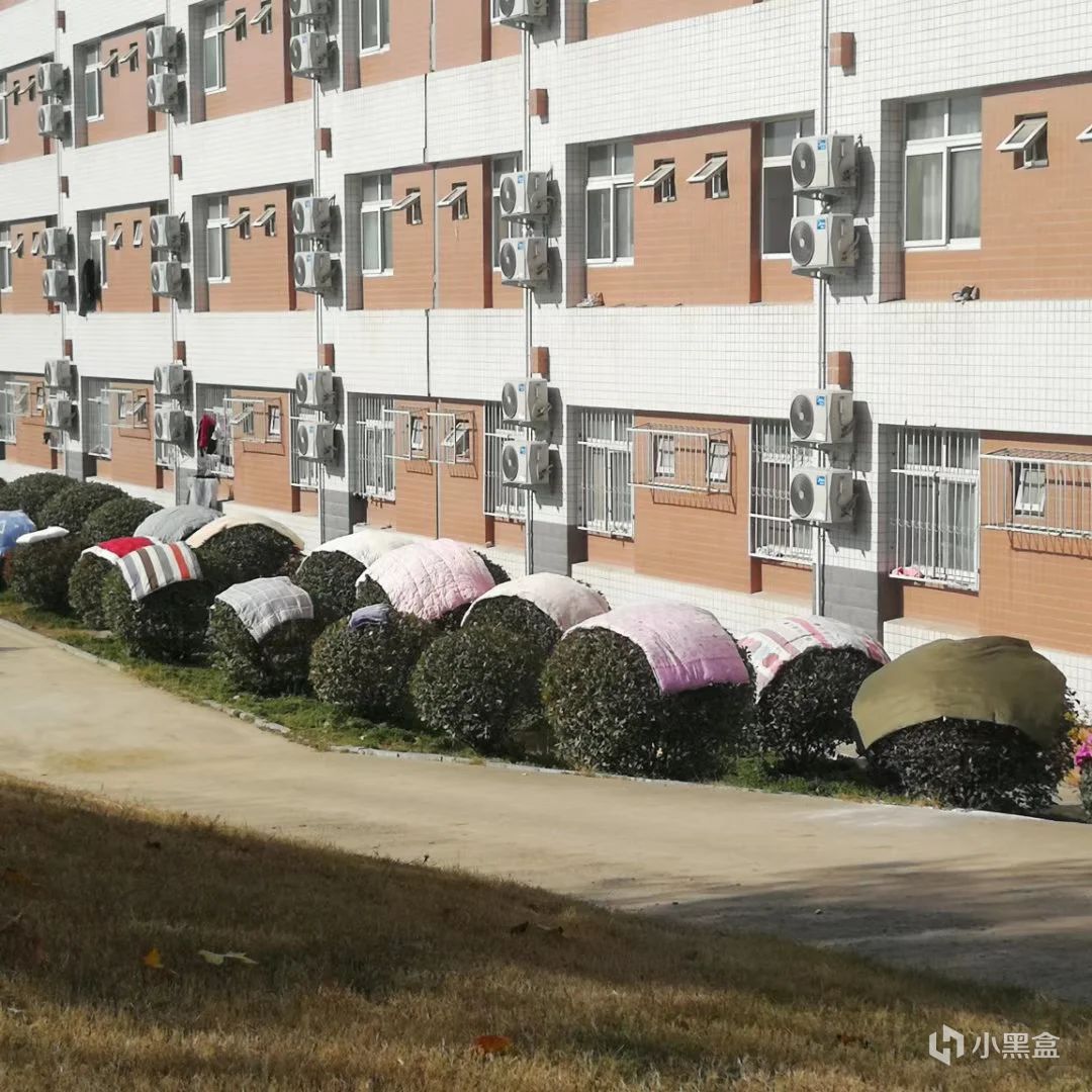 宿舍楼下的石凳、自行车棚栏杆,甚至篮球架横杆上,都铺着五颜六色的被褥;连阳台空间有限的室友,都把被子搭在窗边的暖气片上,活像挂了排小彩旗。