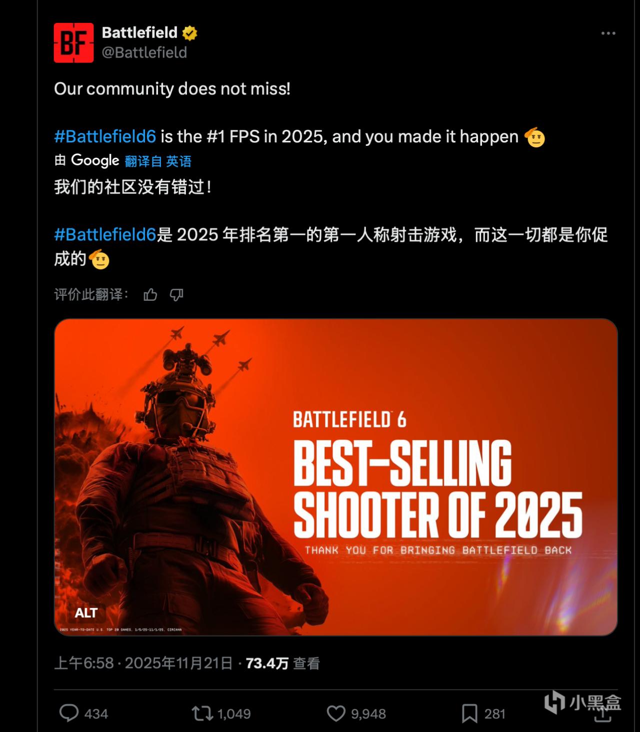 《战地 6》自 10 月初发售以来的表现就远超预期。发售初期,仅 Steam 平台就创下 75 万同时在线玩家的成绩,首周末销量更是突破 700 万份。