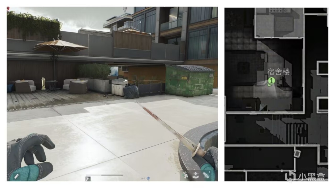 一、宿舍楼中心区域垃圾箱左侧遮阳棚下以及垃圾箱右边地板上