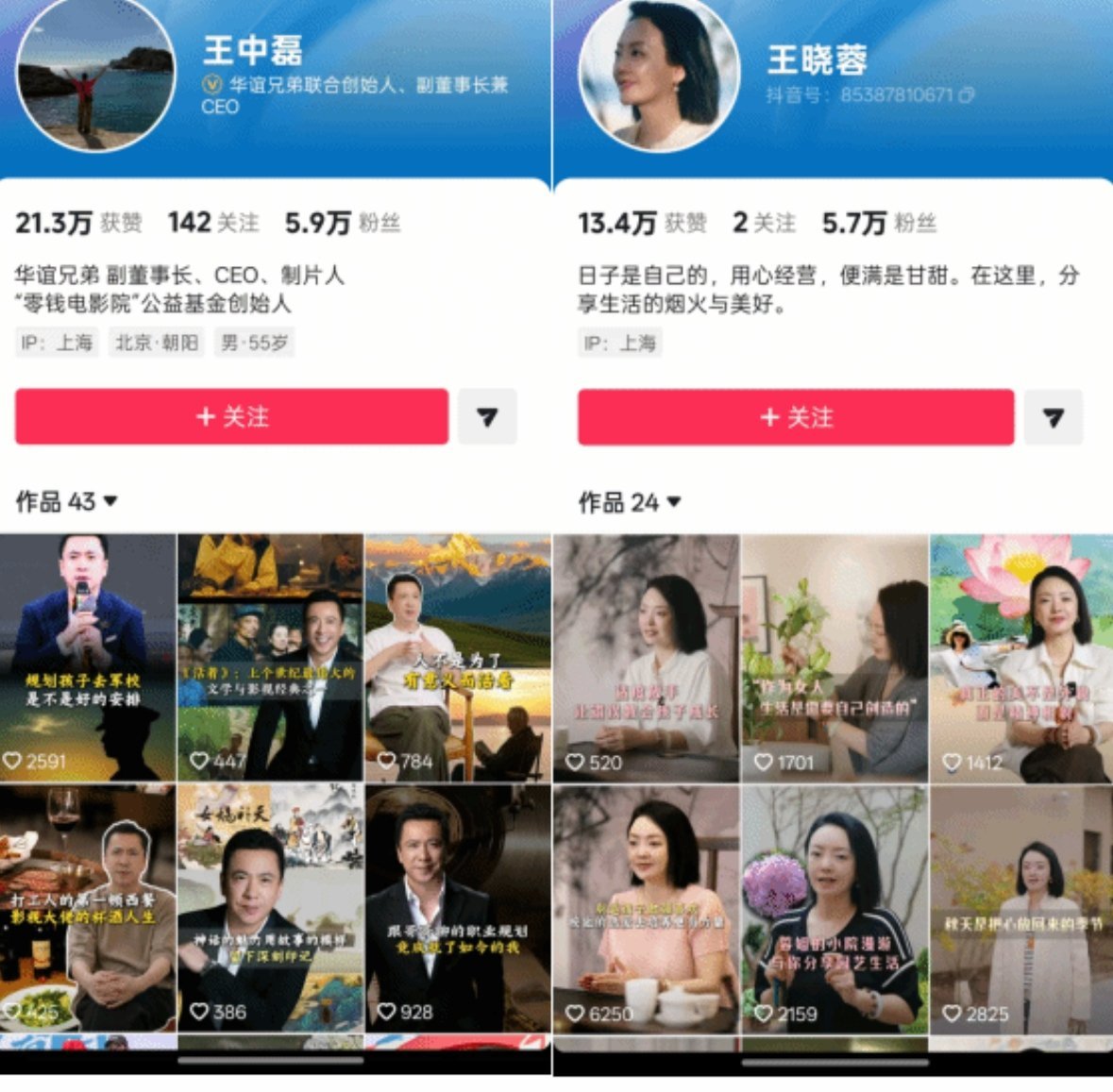 华谊兄弟联合创始人王中磊与妻子王晓蓉近期入驻主流短视频平台,包括微信视频号、抖音、快手和小红书等。王中磊账号内容聚焦创业、工作及电影制作心得,而王晓蓉则分享家庭生活、子女教育等话题。