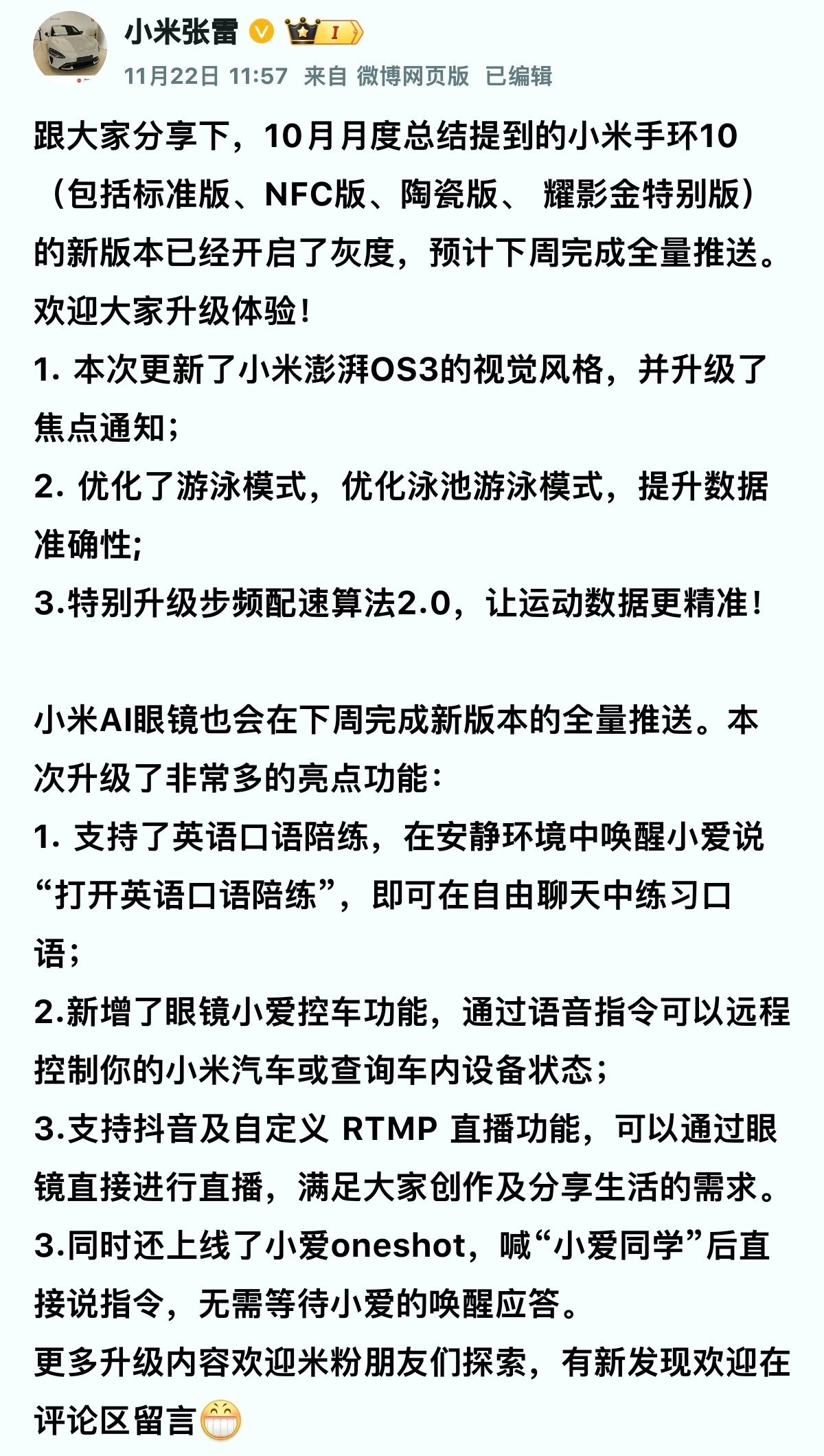 小米手环10和小米AI眼镜新版本已开启灰度,预计将于本周完成全量推送。