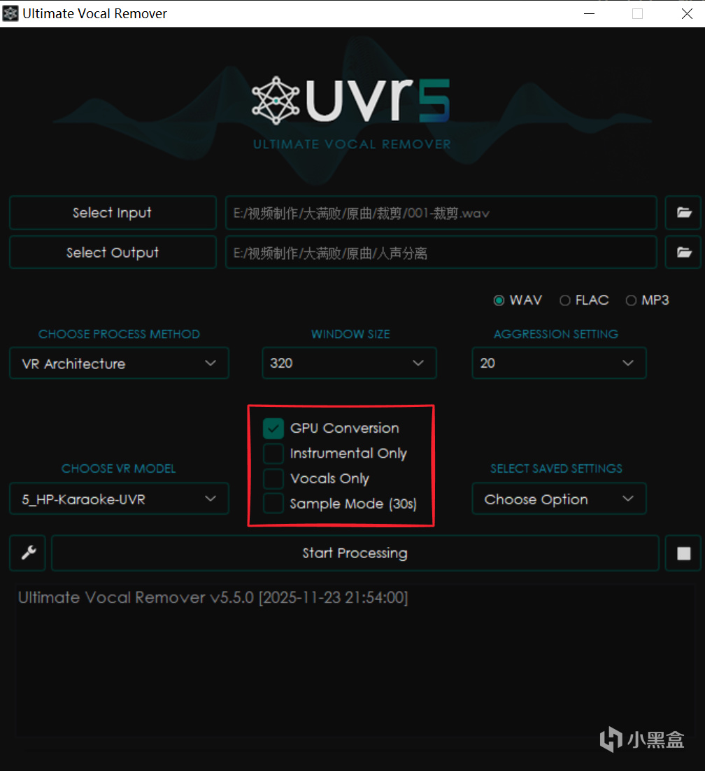 正片开始,首先你需要准备好一段周杰伦的歌曲,比如《发如雪》,把人声和背景音分离。(如果你能直接找到纯人声的话,可以跳过这一段。)我用的是UVR(Ultimate Vocal Remover),这个搜一下就找得到。用的时候注意下下面红框的部分,独显的朋友不用管,核显的话把第一个取消掉,勾第二个和第三个。