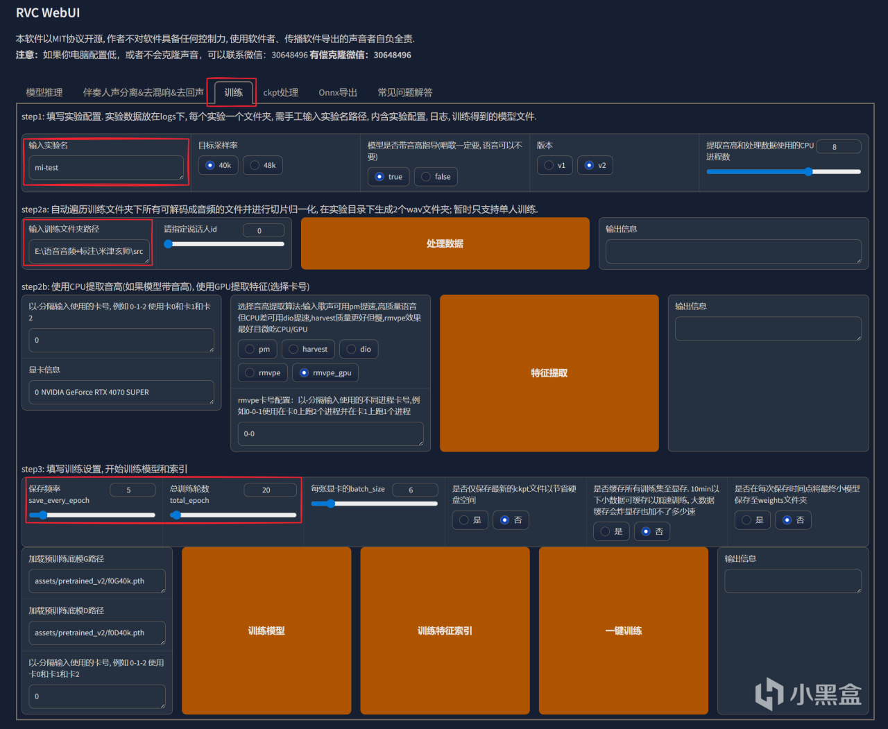 然后把分离出的人声部分喂给Ai,我用的是RVC。打开之后默认是“模型推理”这里,要先切换到“训练“界面。需要改的地方有:
