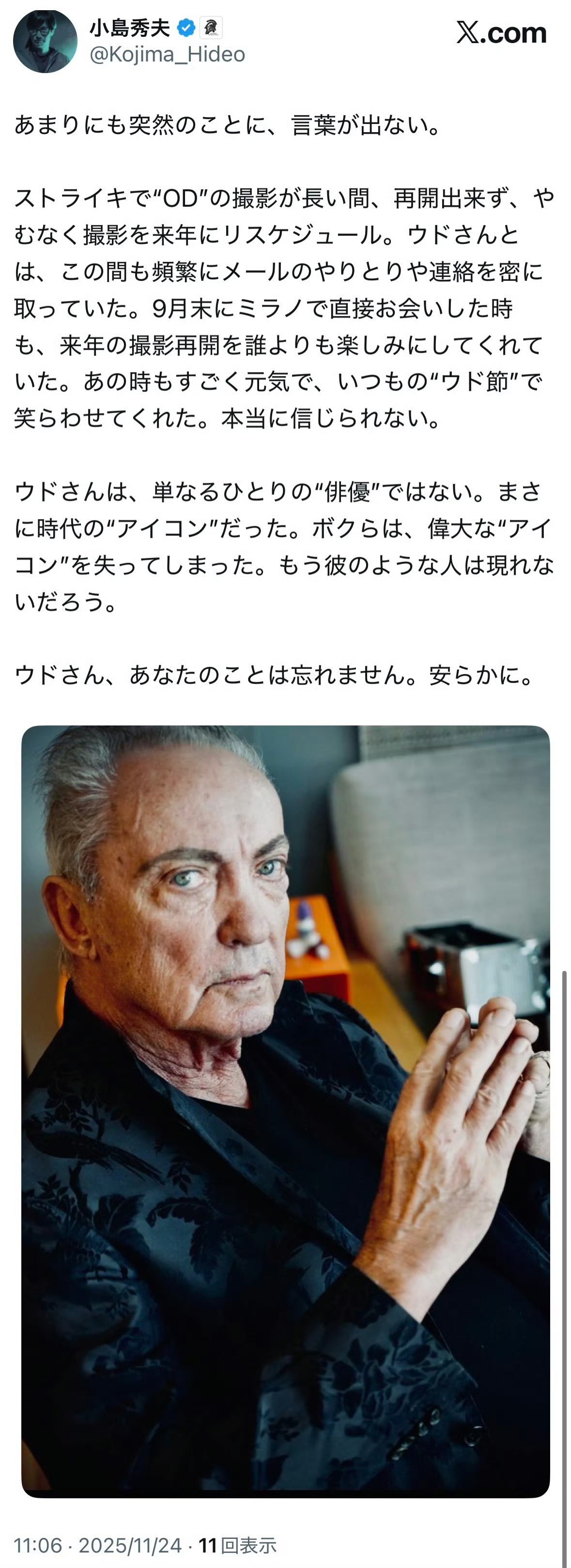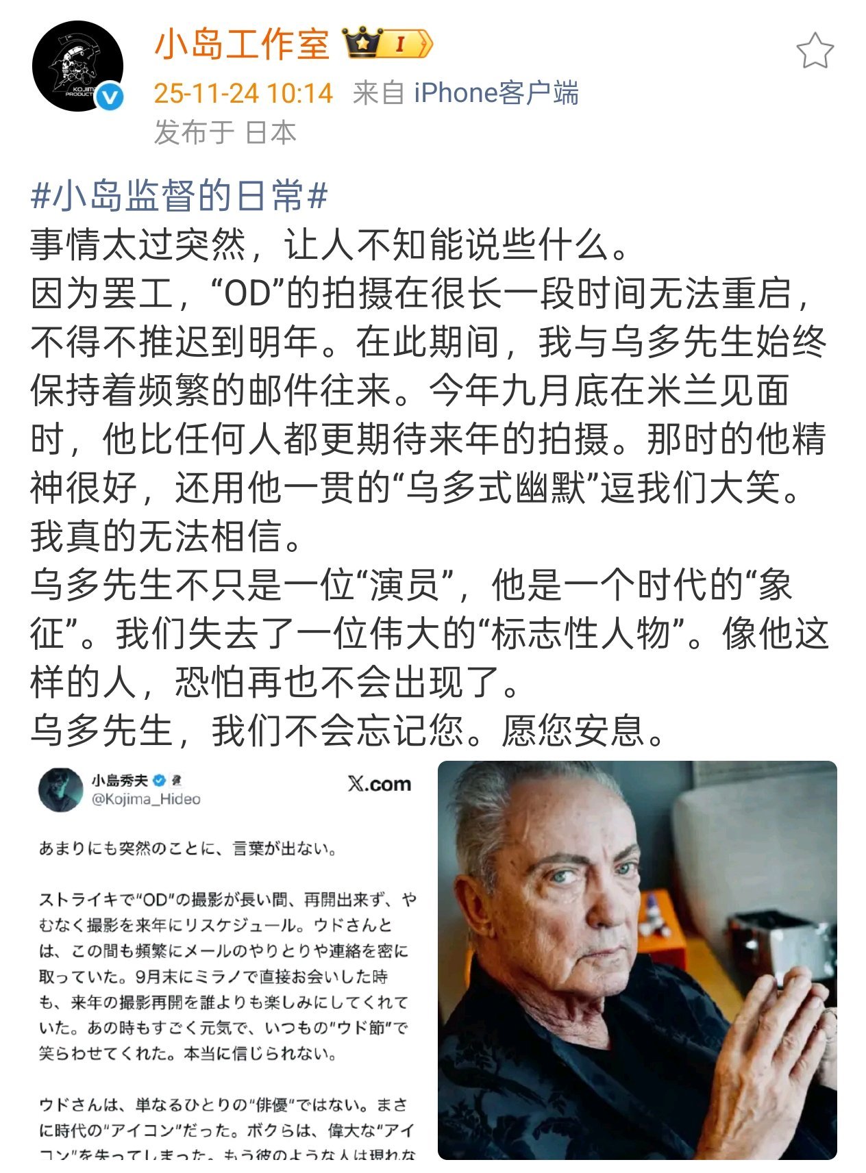据外媒消息,德国男演员尤杜·奇尔(Udo Kier)于2025年11月23日逝世,享年81岁。这位才华横溢的演员原计划出演小岛秀夫备受期待的恐怖新作,其突然离世令全球影迷与游戏玩家深感惋惜。