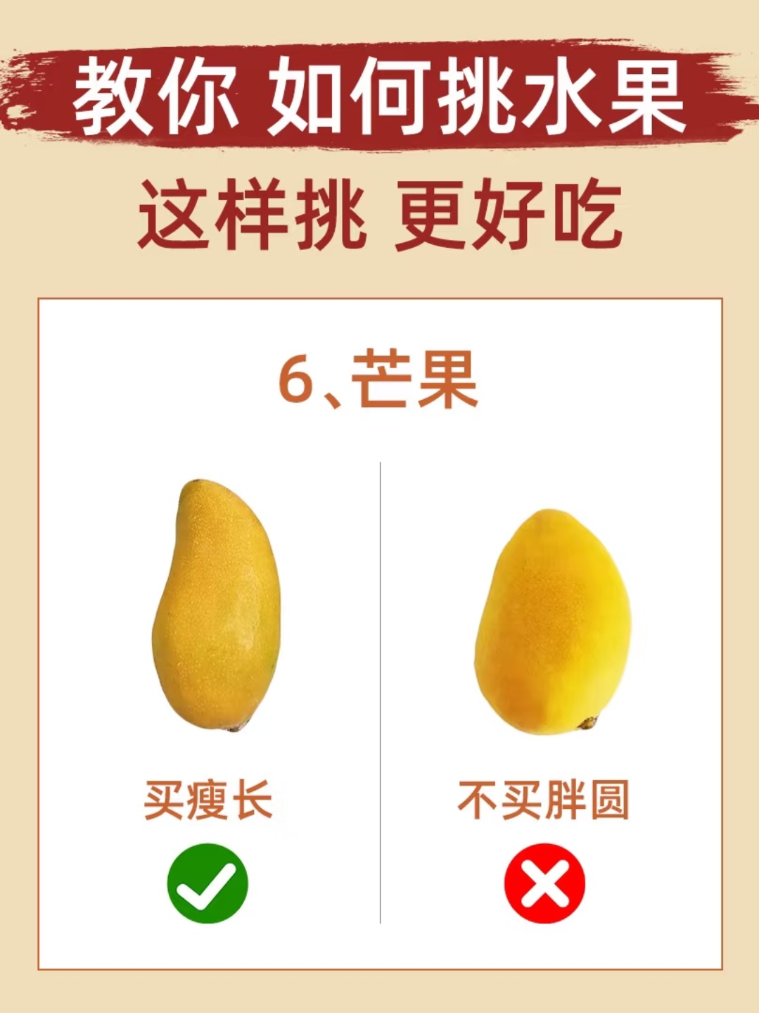 🥭芒果:选瘦长型的,胖圆的核大肉少,啃着不划算;