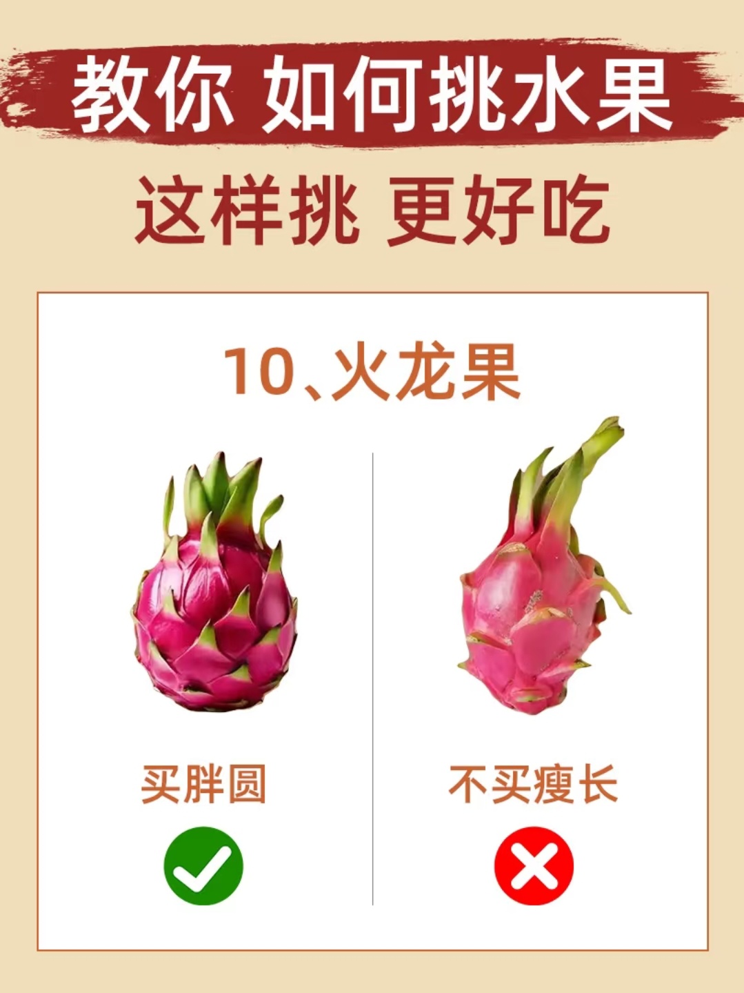 火龙果:胖圆的果肉饱满水多,瘦长的容易干巴没味。