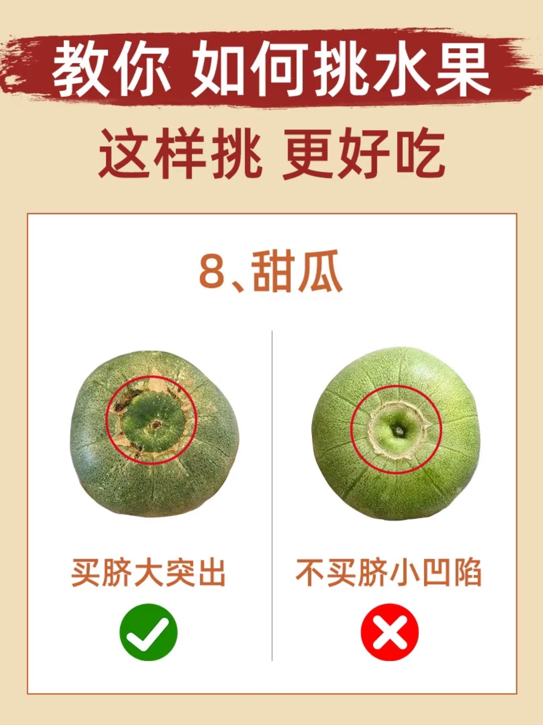 甜瓜(我也喜欢,老家的最好吃了,聊城某县,中国香瓜第一镇):买脐大突出的,闻着甜味比较大的,小凹脐的基本不甜;