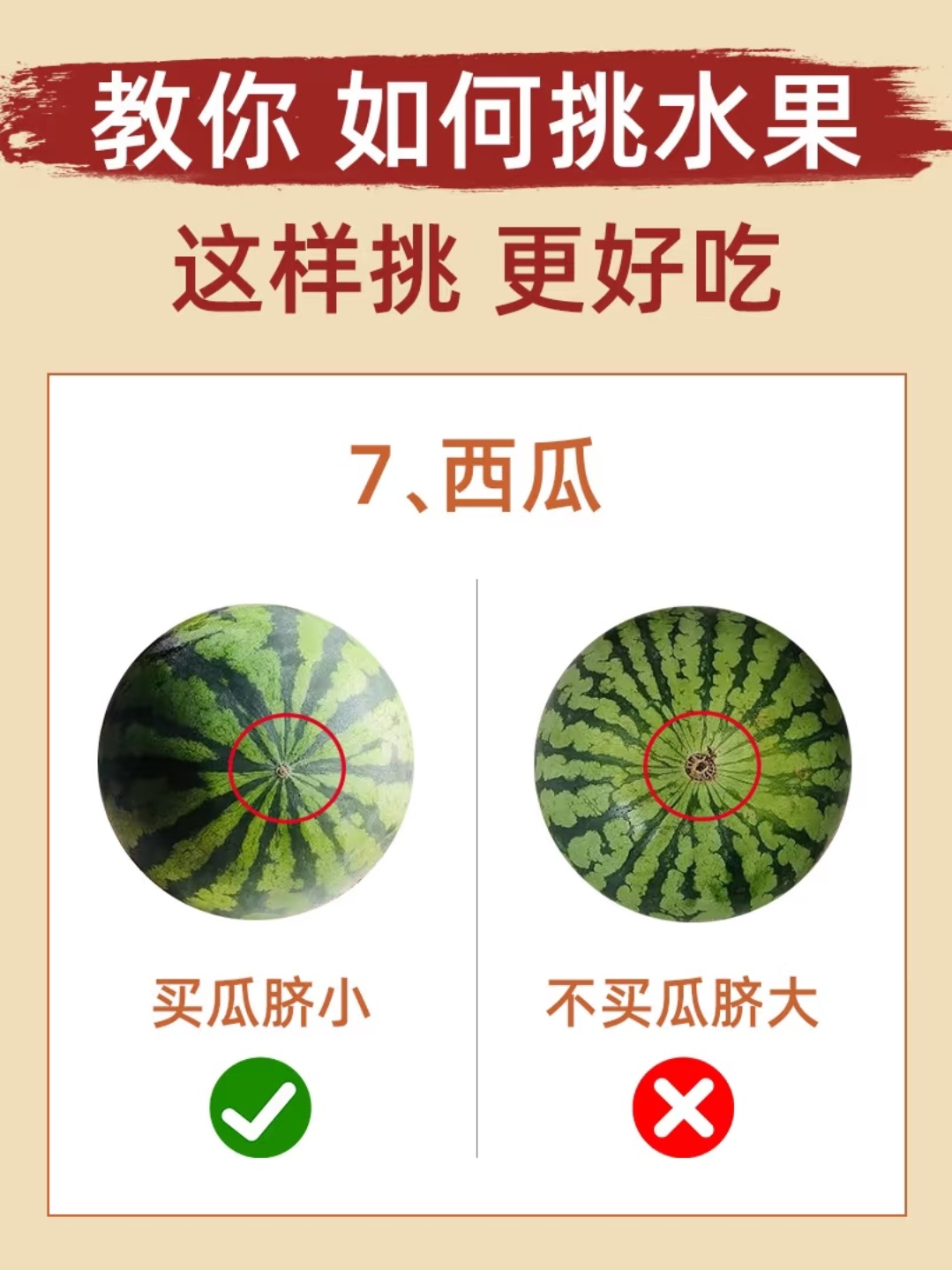 🍉西瓜:挑瓜脐小的,大脐的皮厚瓤少,钱全花在皮上了;