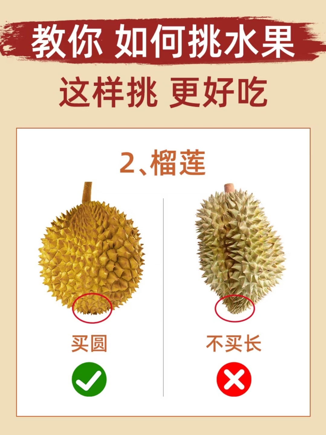 榴莲:选圆滚滚的(肉多味甜),细长条的别碰(核大肉少);