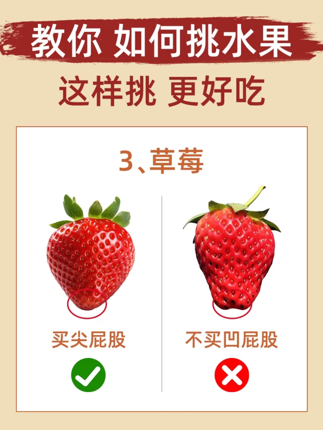 🍓草莓:挑“尖屁股”的,凹屁股的容易空心没味;