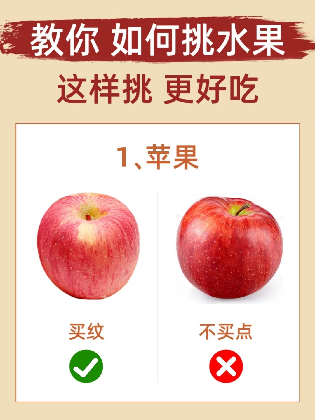 🍎苹果:买带自然纹路的,别买表面点点多的,纹路款甜脆不踩雷;