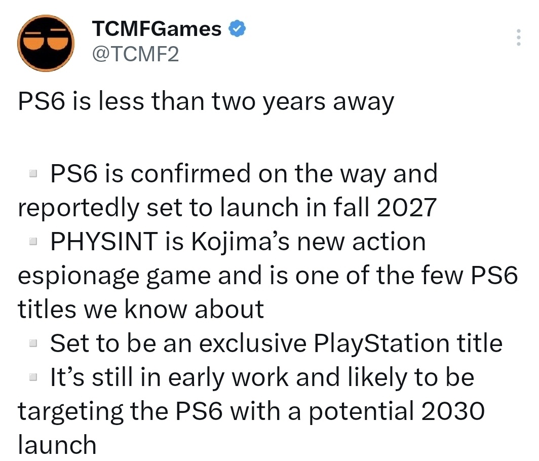 网上冲浪看到推特一个博主爆料了关于PS6的相关信息,还有小岛秀夫的新作《PHYSINT》呢消息?