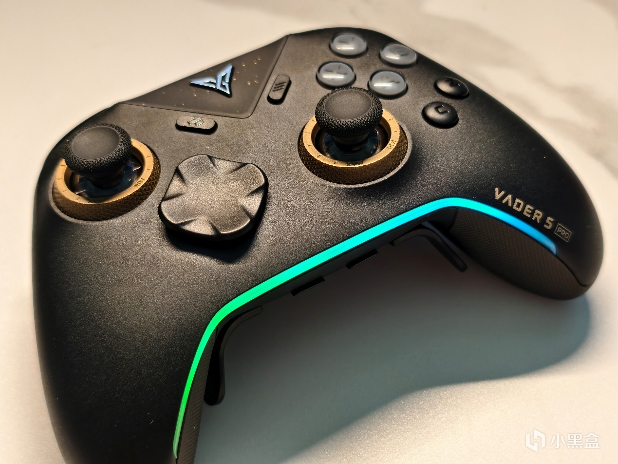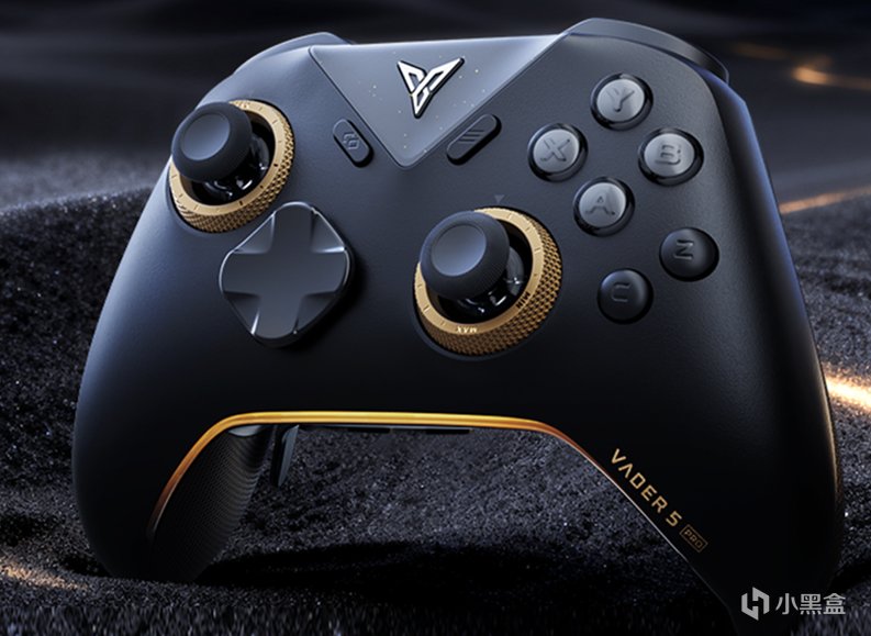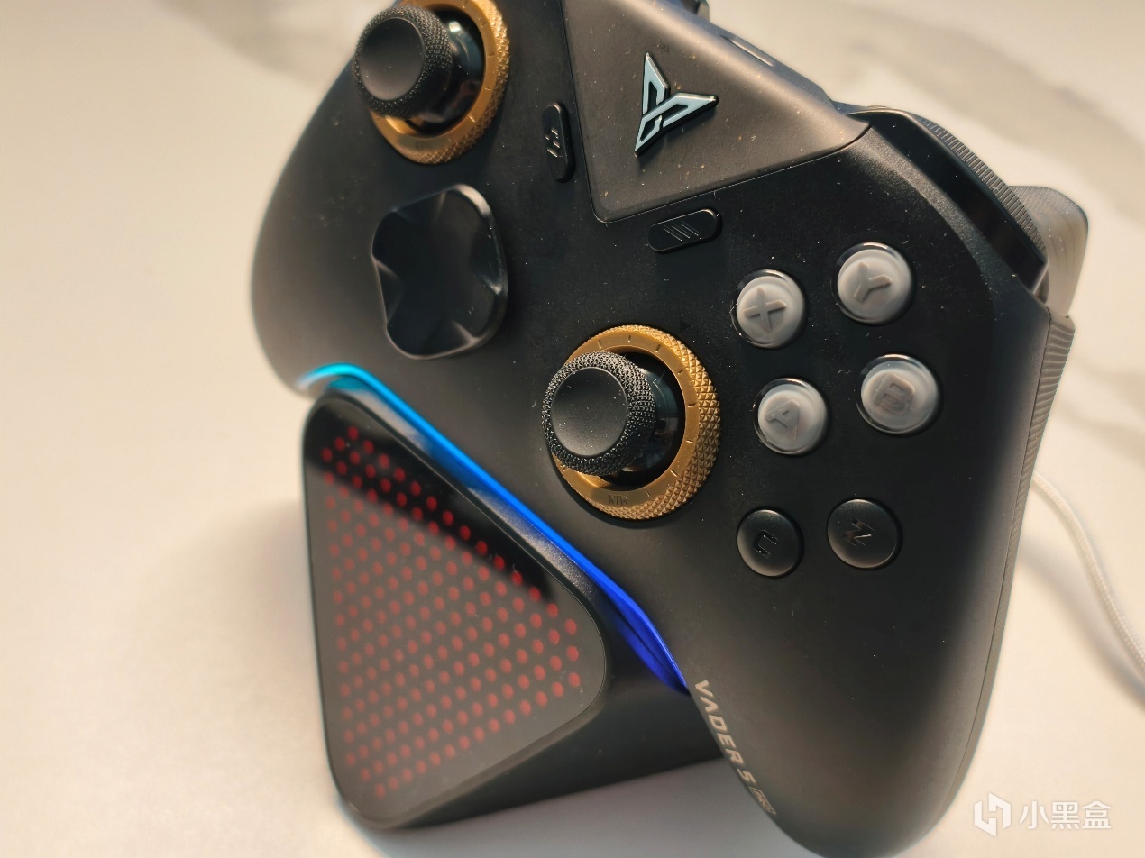 先看正面,黑武士5 Pro延续了上代黑武士的类XBOX手柄的轮廓,但是整体造型更加硬朗。黑色主调搭配了金色的力调节摇杆环,LOGO附近做了一些星空的装饰加之尾部的RGB灯,颇有一种西装暴徒但俏皮的感觉,而扳机键使用了半透明的材质,看起来宛若丝袜一般。