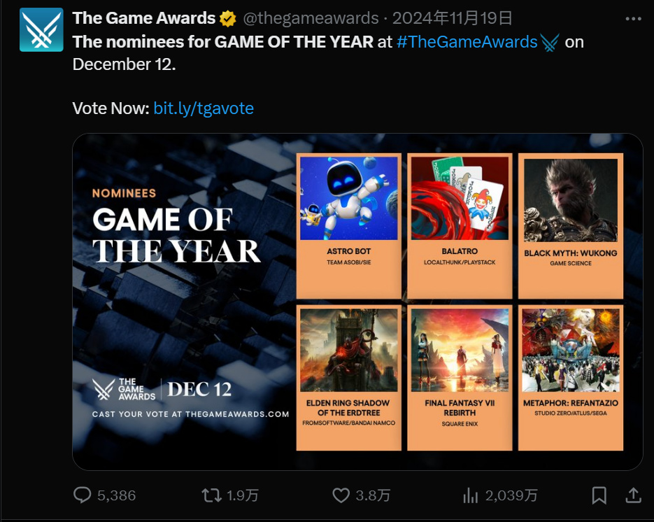 今年TGA的提名公布已经有一阵子了。从目前国内玩家的反响来看,相比去年有《黑神话:悟空》入围年度游戏提名,今年TGA的受关注度显然下滑了不少,你几乎只能在比较核心的玩家圈子里看到相关讨论。