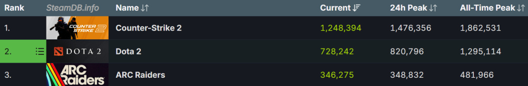 近期《ARC Raiders》的同时在线人数基本稳居Steam第三