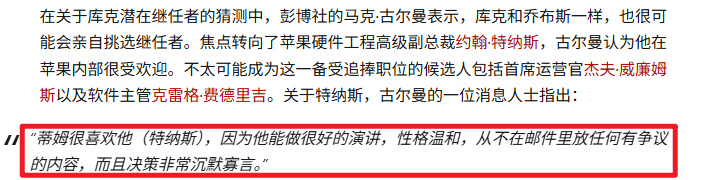 这一点就很值得讲了,因为根据彭博社等媒体的报道,特努斯在苹果内部的评价是很高的。