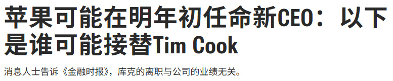 而最近有一个前所未有的大新闻登场了,那就是咱们熟悉的 CEO 库克可能将在明年卸任,并且会有新的 CEO 接棒。