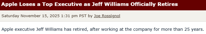 MacRumors -Apple Loses a Top Executive as Jeff Williams Officially Retires