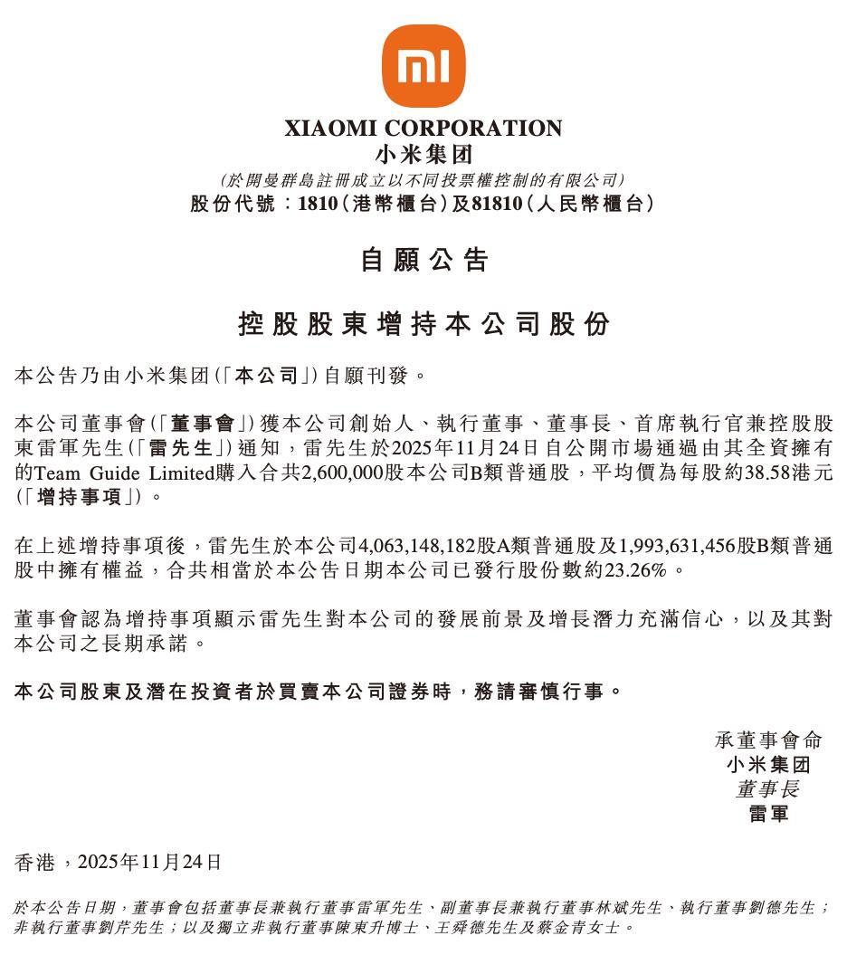 小米集团港交所公告:雷军个人出资逾1亿港元增持260万股,持股升至23.26%。集团本月20日、21日两日共回购2150万股,耗资超8亿港元;上周再以每股37.61港元均价回购1350万股,单日回购金额5.07亿港元,创上市以来纪录。年内累计回购总额已超20亿港元。