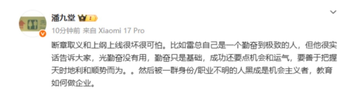 小米产业投资部合伙人潘九堂近日公开发声,为小米创始人雷军鸣不平。他直指当前断章取义和上纲上线的网络风气“很坏很可怕”,并表示雷军尽管是一个“勤奋到极致的人”,却被一些身份不明的网友抹黑为“机会主义者”。