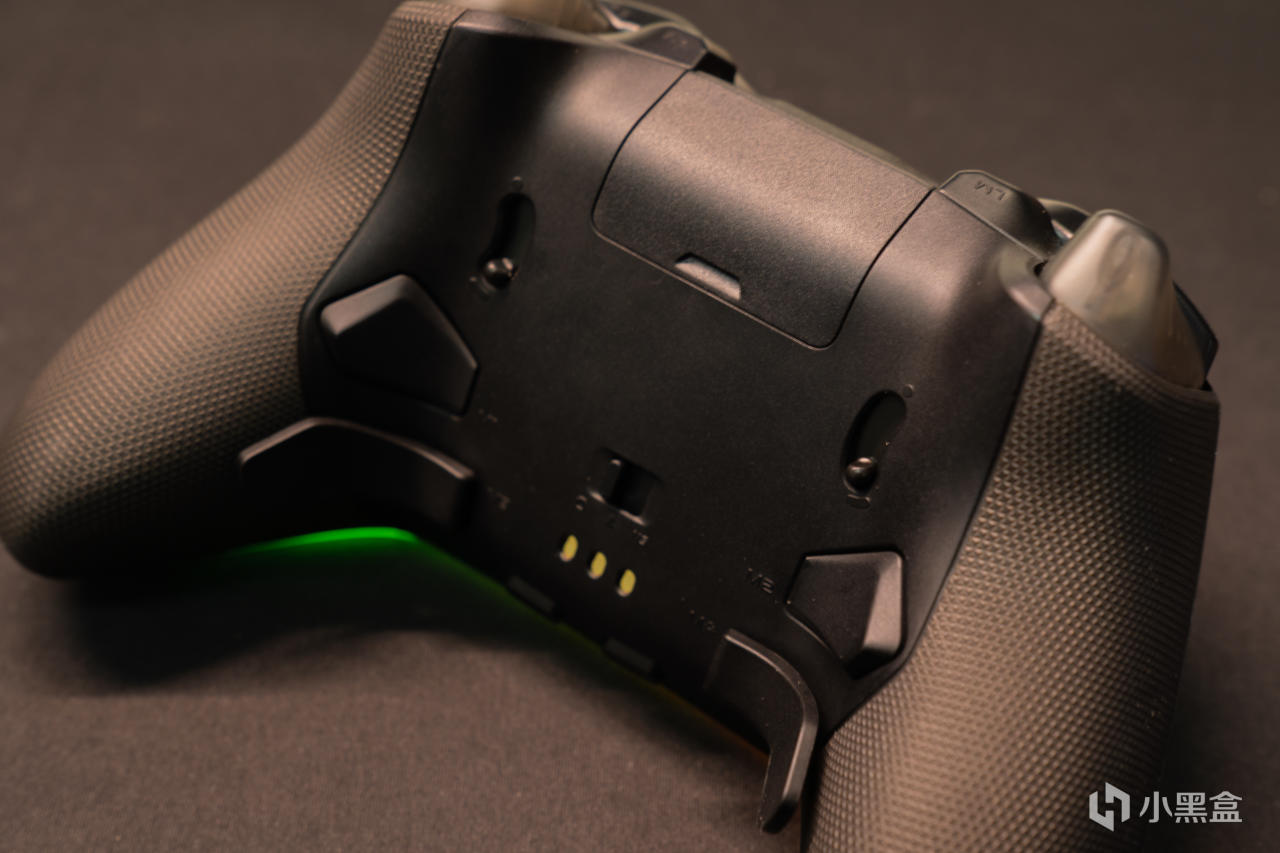 背键上这个 85 同款背键也比 544 提升很大,两个固定背键与两个可拆卸背键,固定两个背键与原来的 m1、m2 位置接近但是更加靠手柄内侧移动了些许距离,这样更加好按也不容易误触,去掉了难按的 m3、m4,换成类似xbox精英的拨片式背键,握持的时候无名指刚好可以搭在拨片式背键上,按起来十分舒适。