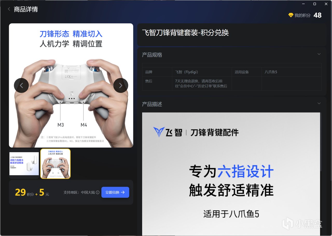 你不喜欢拨片式也没事,飞智空间站商城里可以用积分兑换刀锋拨片,装上后手感十分类似于 dse 的豆豆背键,这个背键我愿称之为最强,用过的都回不去,但 dse 只有两个背键我又不是很喜欢用,545 刚好弥补了这一点。