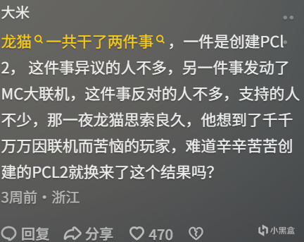 当服务器稳定性逐渐恢复,联机失败率大幅下降时,龙猫在社区写下长文致谢。他细数着玩家们的帮助,感慨没有大家,就没有PCL的今天。