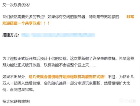 在反复权衡后,他选择向社区坦诚困境,发出了一条简单却真诚的呼吁:希望有空闲服务器资源的玩家,能帮我一起搭建节点,让联机功能能撑下去。