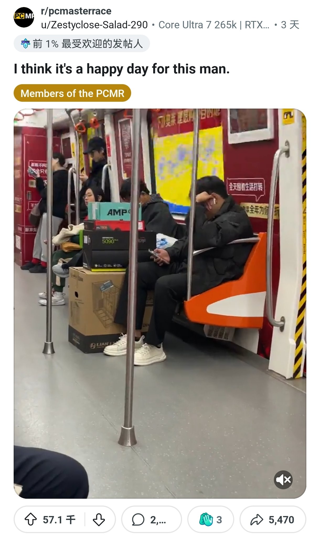中国地铁车厢内,一名男子身旁堆叠着多个电子产品包装箱,其中两箱印有「AMP」和「5090」字样。男子戴耳机专注使用手机,周围乘客无异常反应