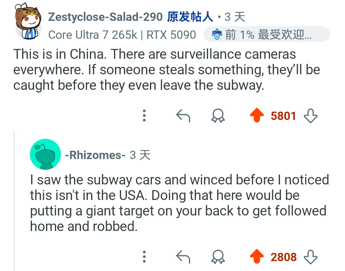 「这是在中国。监控摄像头无处不在。如果有人偷东西,还没出地铁站就会被摁住。」「我刚看到地铁车厢照片时心里一紧,直到发现这不是在美国。要是在我们这儿这么干,简直就像在背上画了个靶子,等着被人跟踪到家门口抢劫。」