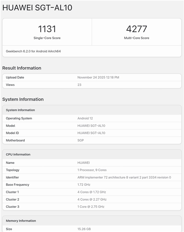 具体来看,麒麟9030采用1+4+4设计,共有9个核心,具体由1*2.75GHz+4*2.27GHz+4*1.72GHz组成,GPU为Maleoon 935,测试机型是华为Mate80 Pro Max,测试机型内存为16GB。