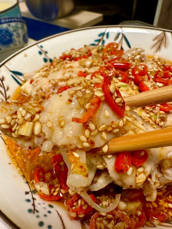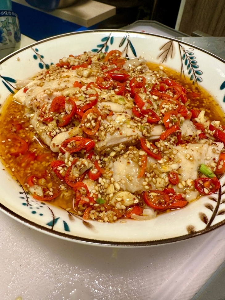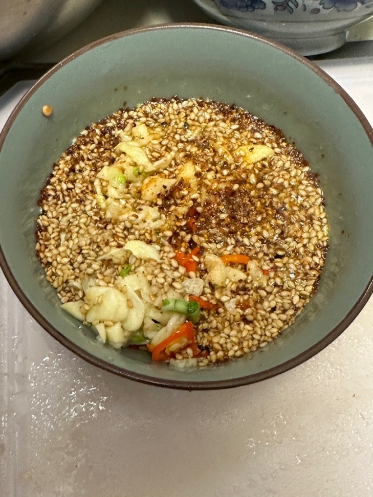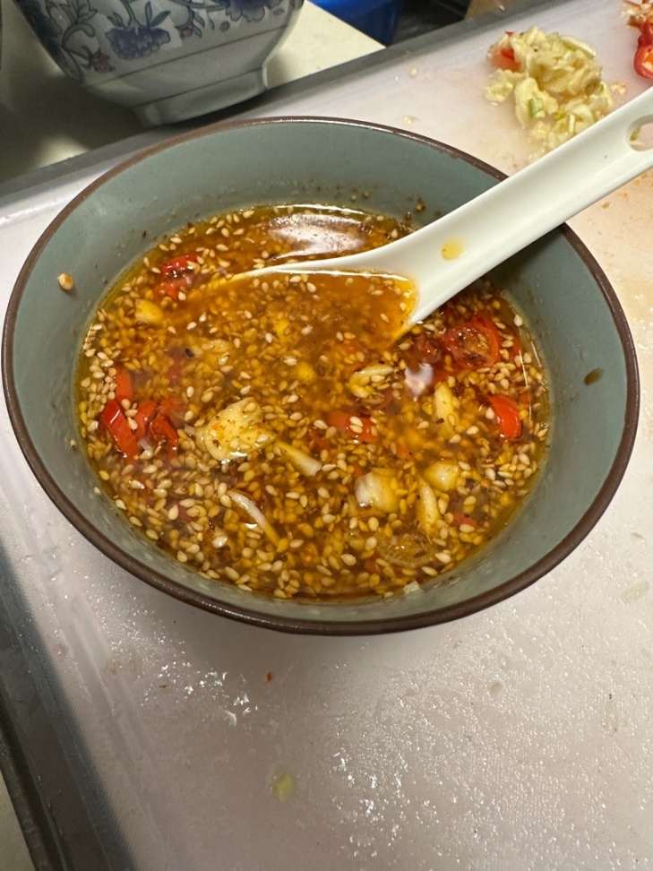 4.准备酱汁:小米椒切圈,加入蒜末、白芝麻、辣椒面,之后淋上适量热油,加入2勺生抽、1勺蚝油、少许鸡精和糖,以及3勺煮鸡腿的汤