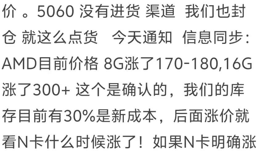 但沒想到行情變化的這麼快,短短几天渠道報價就已經上調成本了,工廠開始減少出貨,部分型號甚至直接無貨可供(5060、5070),AMD跟英偉達都有上漲的想法,跟之前的說法一樣,顯存越大漲的越多,而且漲幅比想象的大: