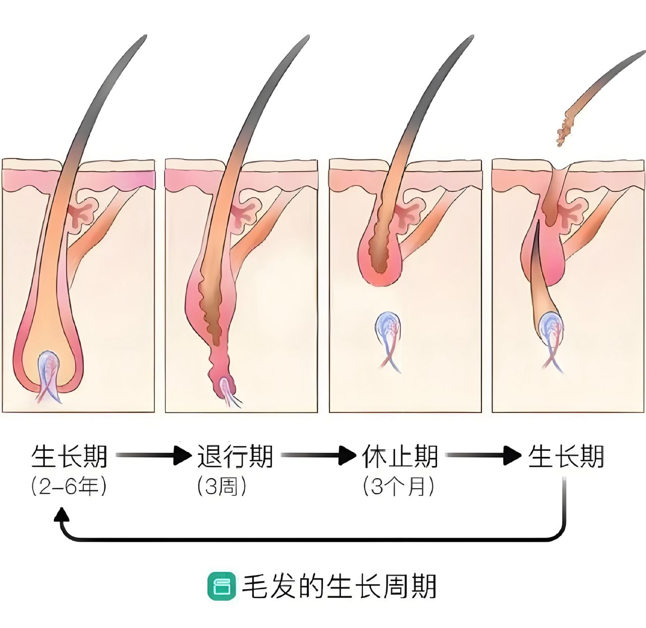 3、休止期(退休脱落期):持续约3个月。毛囊进入完全休眠状态,旧的毛发“光荣退休”,只等你在梳头、洗澡时轻轻一碰,它就自然脱落。随后,毛囊休整完毕,会重新启动一个新的“生长期”,长出新的毛发。