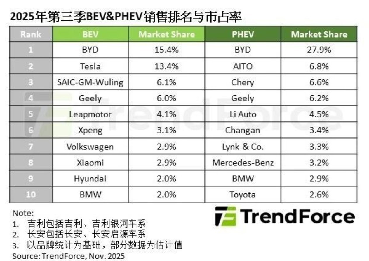 据TrendForce集邦咨询最新发布的2025年第三季度全球新能源车销量报告,小米汽车首次跻身全球纯电动车销量榜单第八名,创下品牌历史最佳排名。
