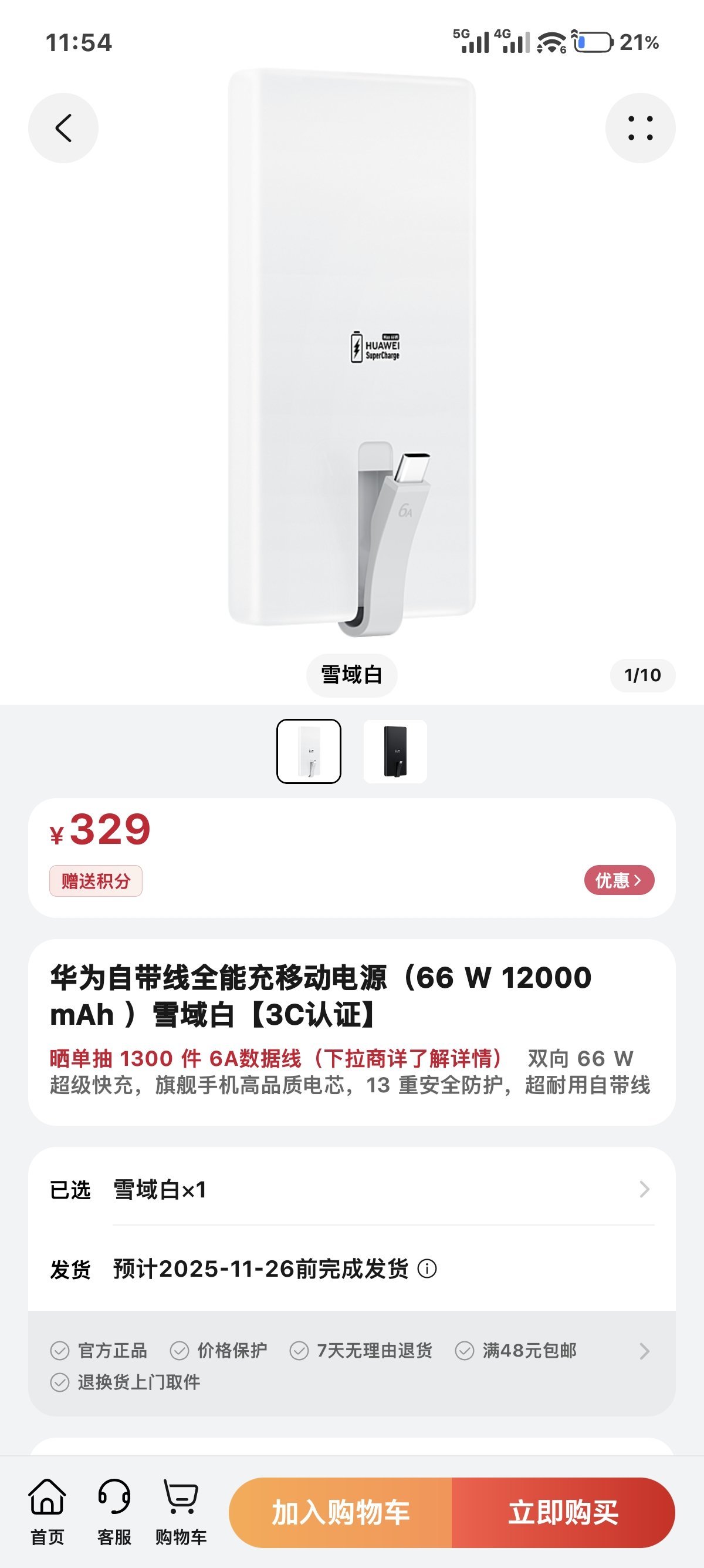 华为近日新上架了自带线充电宝66W的版本,售价329元,黑白配色。